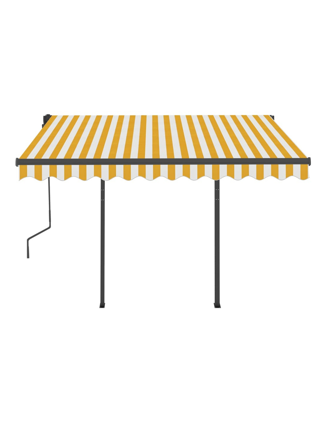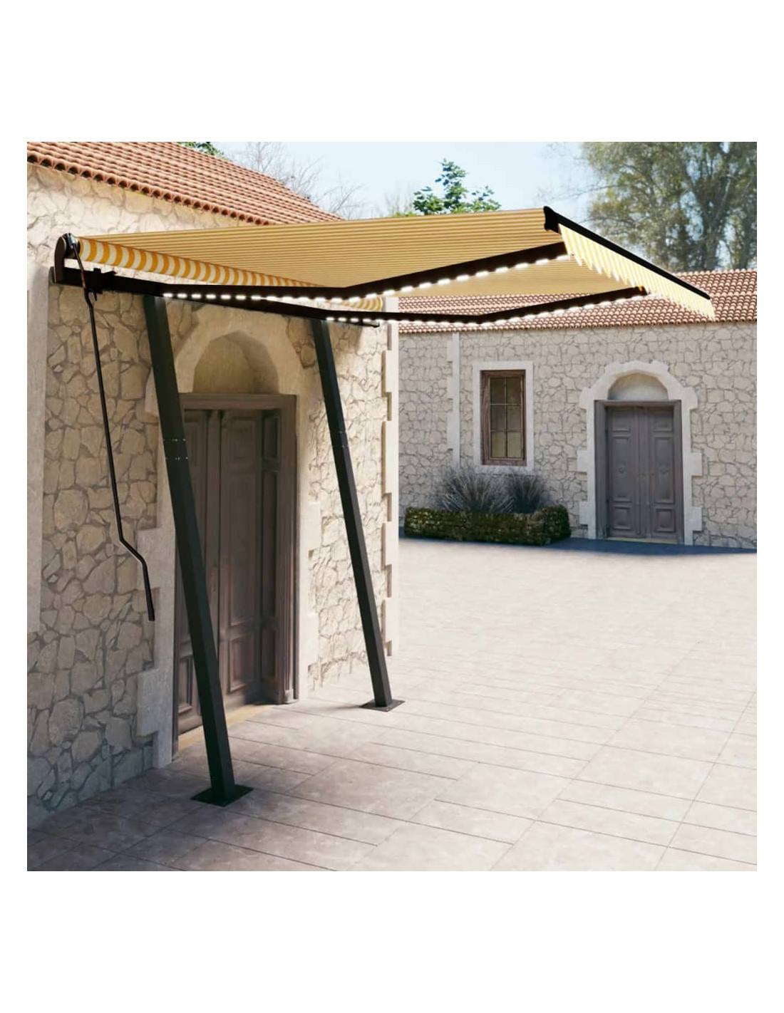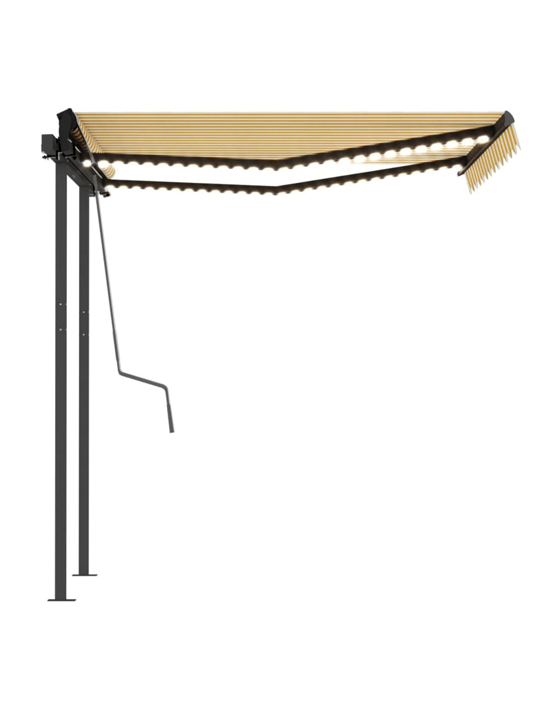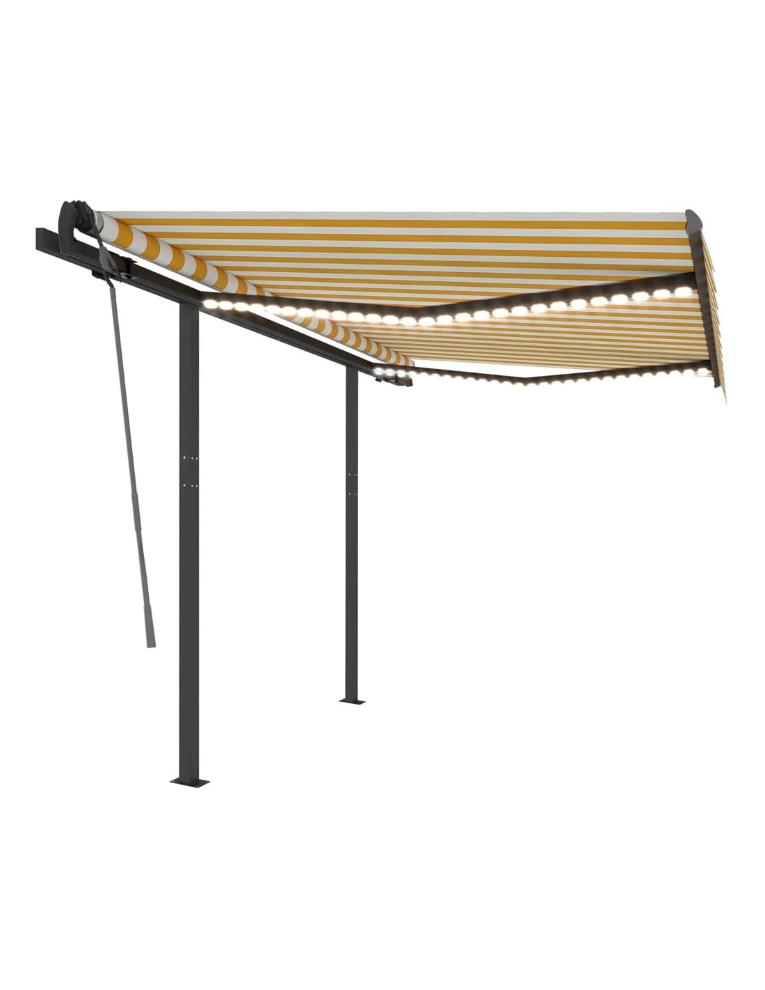 Questa tenda da sole per esterni, costruita con un telaio in alluminio verniciato a polvere antiruggine, è leggera ma robusta. I sostegni in ferro conferiscono ulteriore stabilità. Il tessuto della tenda da sole è realizzato in poliestere ad alta densità con rivestimento in PU, resistente all'acqua e ai raggi UV. L'angolazione e l'altezza possono essere regolati per soddisfare le vostre esigenze. Grazie al telecomando incluso è possibile aprire e ritrarre la tenda da sole con facilità. La tenda è dotata anche di manovella per il funzionamento manuale. È inoltre dotata di un sensore del vento che può chiudere la tenda automaticamente nelle giornate ventose. Le luci a LED forniscono un'illuminazione a risparmio energetico durante la notte.