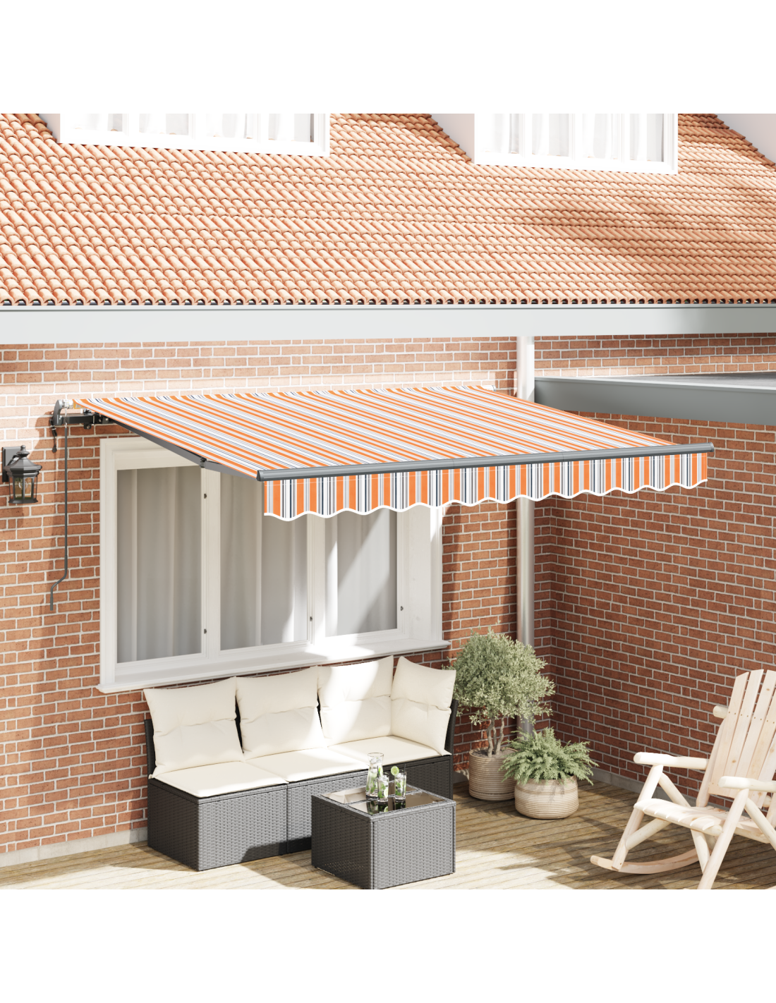 Questa moderna tenda retrattile è perfetta per giardini e terrazze. Unisce stile e funzionalità, con un design elegante e rigato che offre ombra dai raggi solari in estate.
