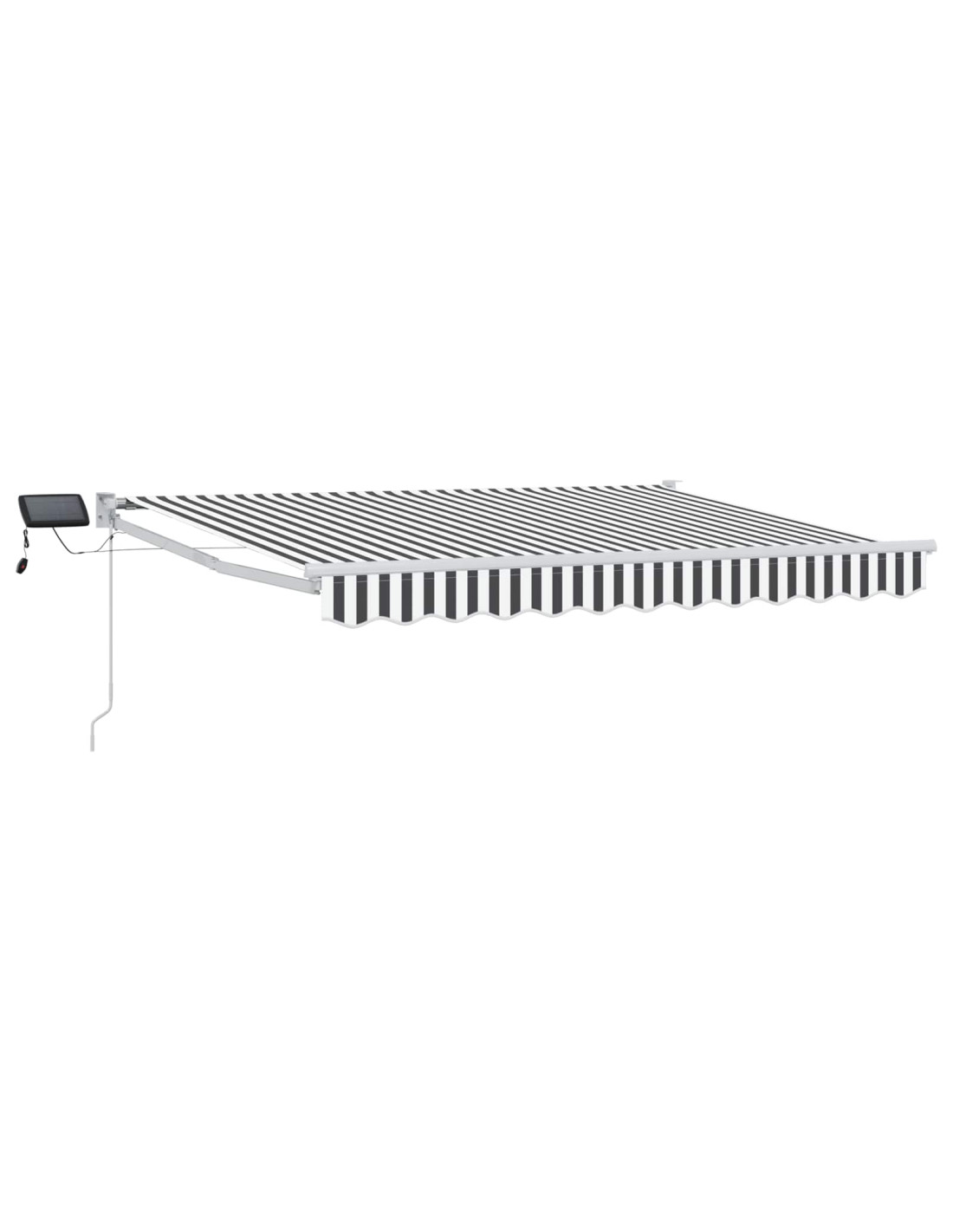 Questo tendone esterno con luci LED solari dà ombra e illuminazione per patii e terrazze. Grazie al suo design retrattile, puoi regolare la copertura dal sole come vuoi. Le luci LED si caricano durante il giorno e forniscono luce di sera, senza bisogno di una presa. Tessuto resistente all'acqua: Realizzato in poliestere con rivestimento in PU, è fatto per resistere a sole e pioggia. Ottimo per un uso esterno regolare, dà ombra in qualsiasi condizione. Struttura robusta: Il telaio in acciaio verniciato a polvere e alluminio offre una base solida. Resistente alla corrosione, mantiene stabile il tendone durante l'uso quotidiano. Funzionamento manuale: Puoi estendere o ritirare il tendone manualmente grazie alla maniglia a manovella. La struttura montata a muro permette di regolare l'area d'ombra secondo la luce solare. Illuminazione LED solare: Le luci LED si ricaricano durante il giorno, fornendo una luce base all'esterno la sera. Questo ti permette di avere un'illuminazione senza bisogno di una fonte di energia esterna. Componenti di montaggio: Include tutto il materiale necessario per l'installazione. Segui le istruzioni fornite per montarlo facilmente e in sicurezza.