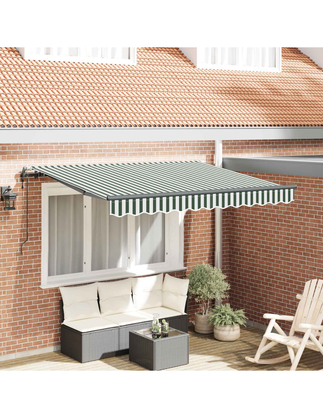 Questa moderna tenda retrattile è perfetta per giardini e terrazze. Unisce stile e funzionalità, con un design elegante e rigato che offre ombra dai raggi solari in estate.