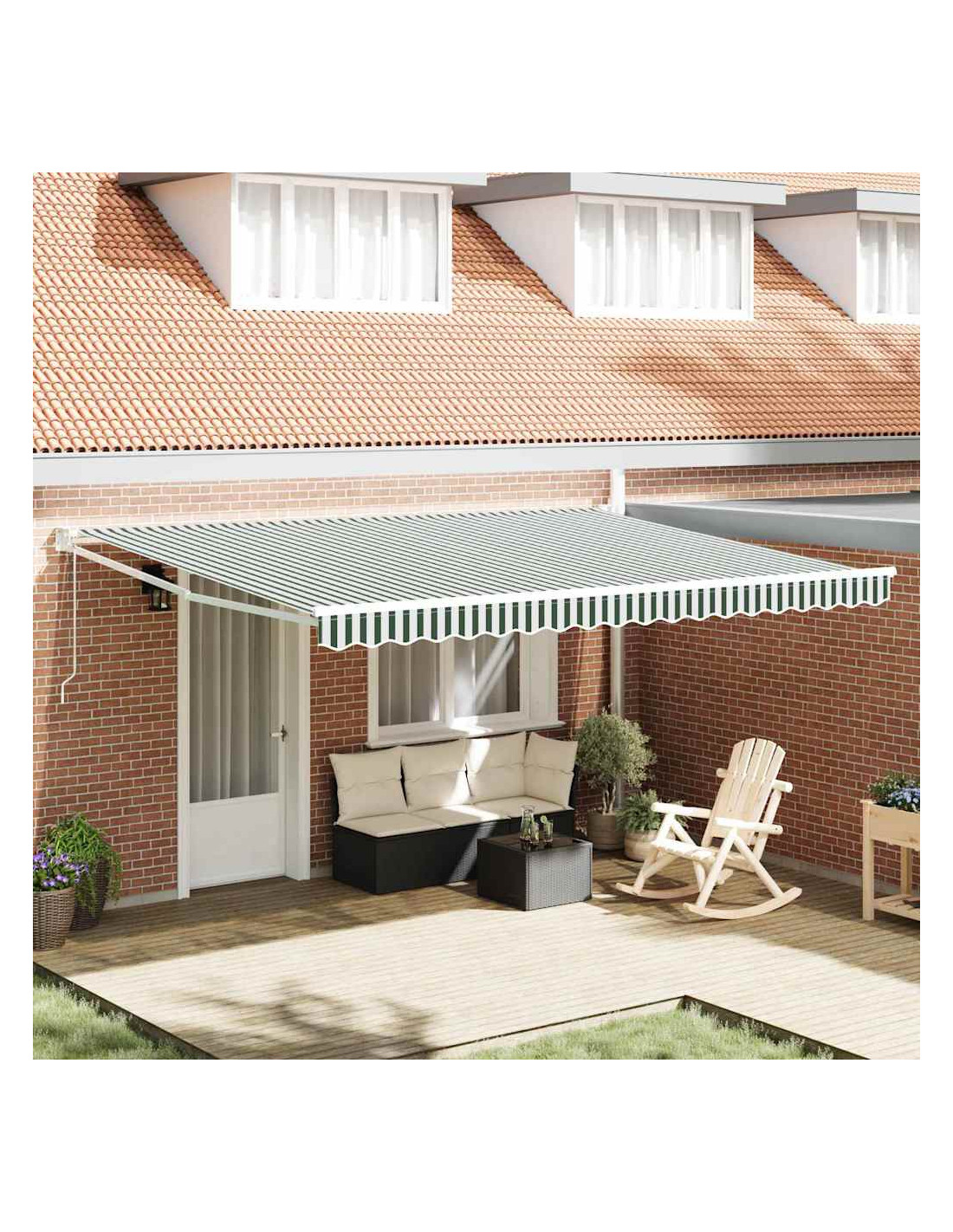 Questa tenda retrattile è la soluzione perfetta per creare ombra in spazi esterni come giardini e terrazze. Con il suo stile semplice e moderno, aggiunge un tocco di eleganza al tuo ambiente senza compromettere la funzionalità. I colori vivaci verde e bianco rendono il tuo spazio esterno più fresco. Grazie alla sua caratteristica retrattile, potrai godere della giusta ombra in qualsiasi momento della giornata, perfetta per cene all'aperto o momenti di relax. Materiali resistenti ai raggi UV: Progettata per resistere ai raggi UV, il tessuto in poliestere di questa tenda mantiene a lungo il colore e la sua forma. La protezione UV assicura una buona condizione del tessuto e offre sicurezza proteggendo dagli effetti nocivi del sole, rendendo l'uso all'aperto sicuro e piacevole. Meccanismo retrattile: Grazie al telaio retrattile, puoi regolare facilmente l'ombreggiatura in base alle tue necessità. È facile da usare, permetttendo di adattare la posizione della tenda in base all'angolo del sole o ai tuoi gusti personali, migliorando così il comfort. Struttura robusta: Costruita in metallo resistente, la tenda offre supporto e stabilità anche con vento forte, perfetta per l'uso all'aperto. L'abbinamento di materiali in poliestere e metallo garantisce una struttura solida che rimane stabile anche in condizioni di vento intenso. Copertura generosa: Con dimensioni di 450 x 300 cm, la tenda offre un'ampia area ombreggiata, perfetta per eventi o un po'di tranquillità all'aperto. La sua spaziosità consente diverse configurazioni, adattandosi perfettamente a tavoli e sedie. Assemblaggio semplice richiesto: Viene consegnata in componenti, includendo 1 x parte superiore e 1 x telaio. Richiede il montaggio con un cacciavite da parte di due persone. Questa semplice configurazione permette di godere rapidamente dello spazio esterno rinnovato, garantendo che la tenda sia pronta all'uso senza complicazioni.