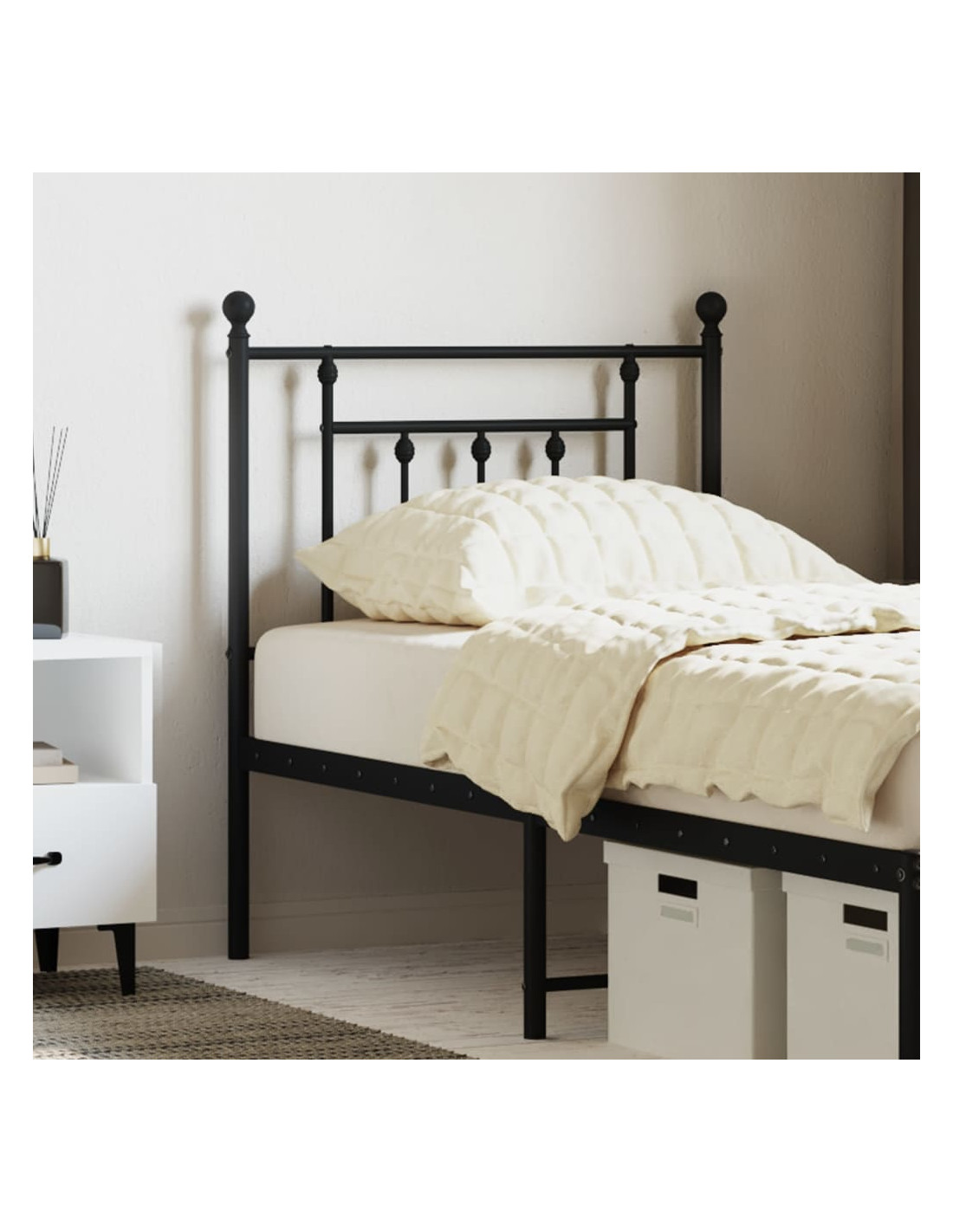 - Robusta struttura in metallo: La testiera del letto è realizzata in acciaio verniciato a polvere. L'acciaio è un materiale eccezionalmente duro e resistente, e offre straordinaria robustezza e stabilità. La verniciatura a polvere dell'acciaio crea uno strato protettivo contro l'usura.