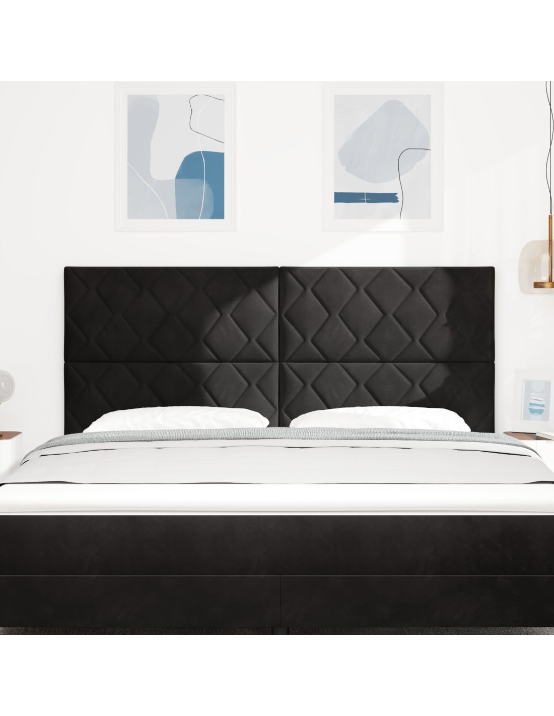 - Materiale in Velluto Morbido: La testiera è rivestita in velluto pregiato, famoso per il suo tocco morbido e brillantezza elegante. Questo materiale migliora l'atmosfera della tua camera da letto con la sua sensazione ricca e ti fa stare comodo. È facile da mantenere e resistente, mantenendo il suo aspetto invitante nel tempo.