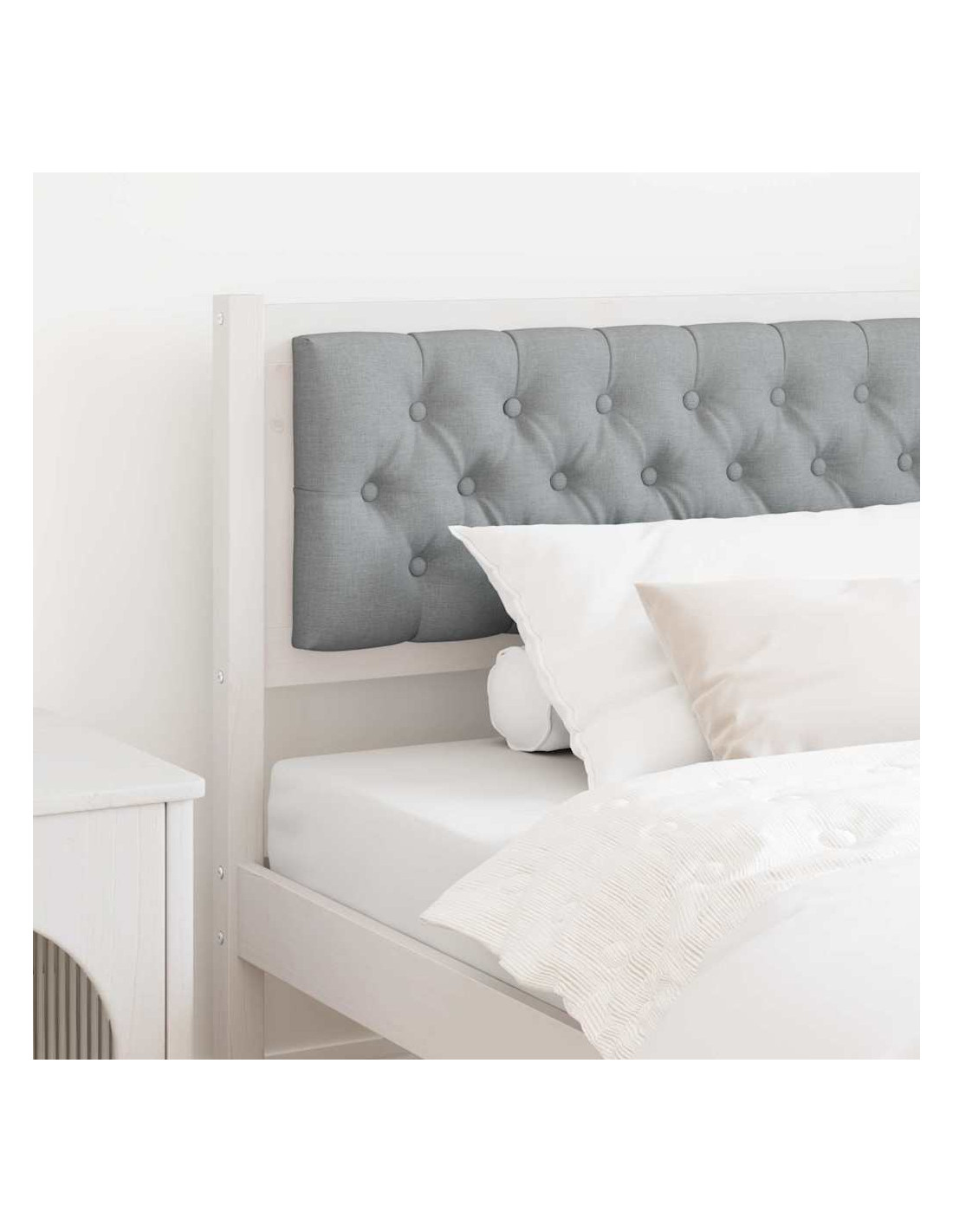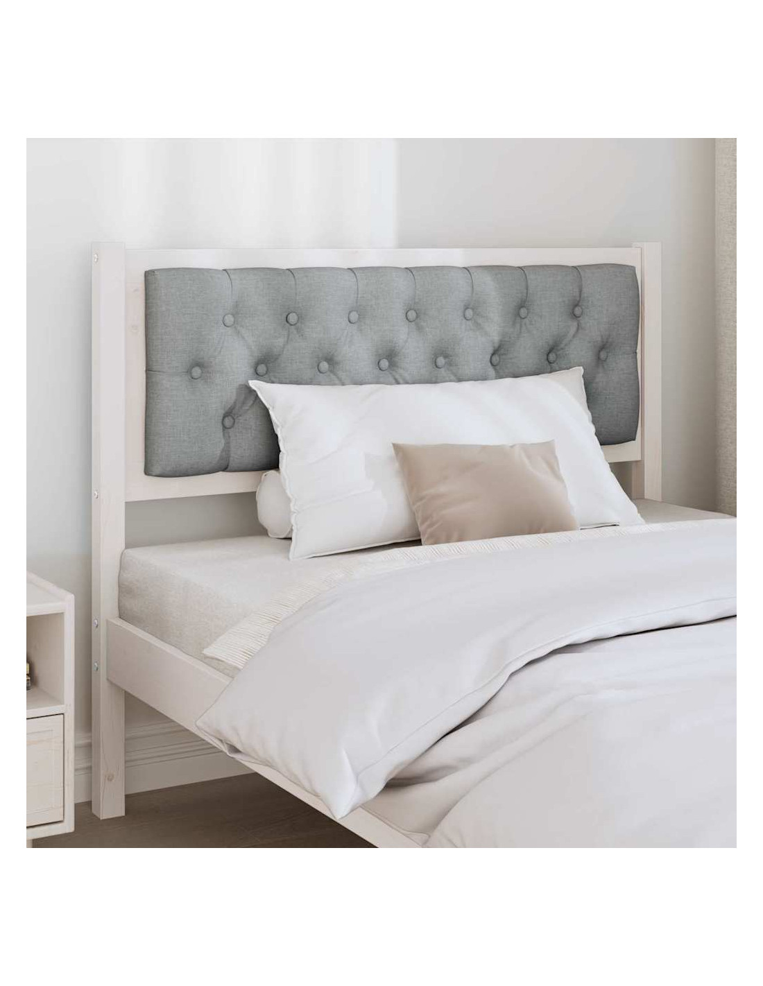 - Materiali premium: Fatto in legno massello di pino, questa testata è forte e durevole. Il legno di pino è noto per la sua robustezza e mantiene un aspetto lucido nel tempo. Il tessuto grigio chiaro aggiunge un tocco morbido e rilassante.