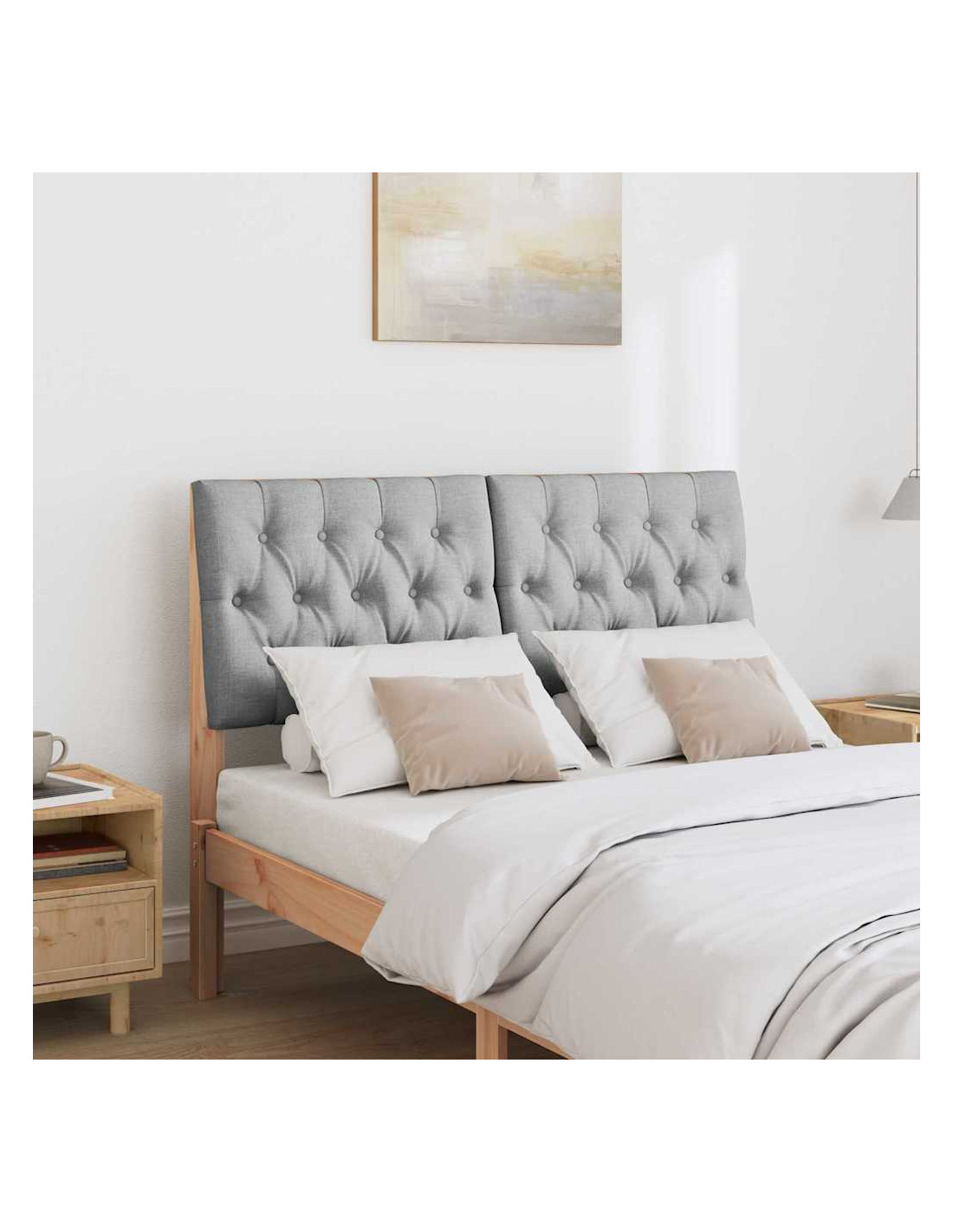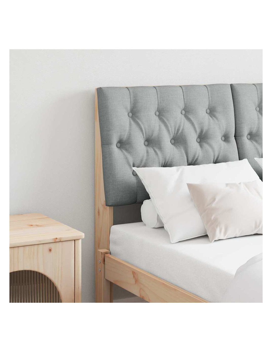 - Materiali: Costruita in legno massello di pino di alta qualità, questa testata offre supporto solido e durabilità. La finitura legnosa aggiunge un elemento naturale, mentre la tappezzeria in tessuto offre una superficie soffice e resistente alle macchie. Questo mix la rende una scelta top per chi cerca eleganza e funzionalità nella camera da letto.