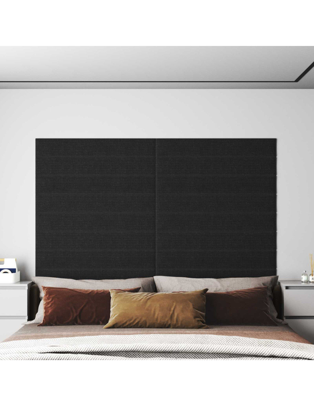 - Tessuto e legno ingegnerizzato: Realizzata con una superficie in tessuto e una base in legno ingegnerizzato, la testiera si presenta solida e ha un aspetto raffinato, perfetta per le pareti della camera da letto.