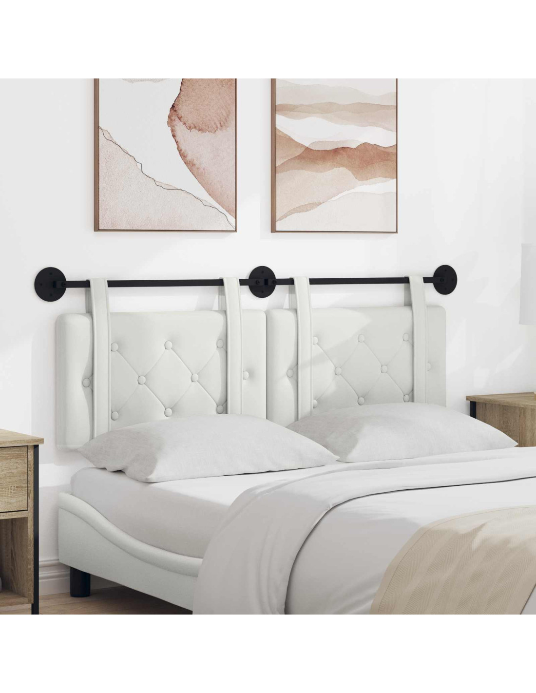 - Cinture rimovibili Il design include cinture rimovibili con chiusure a strappo, per una facile installazione sulla parete. Questa caratteristica rende semplice riposizionare o rimuovere la testiera, aggiungendo anche flessibilità nel layout della stanza.