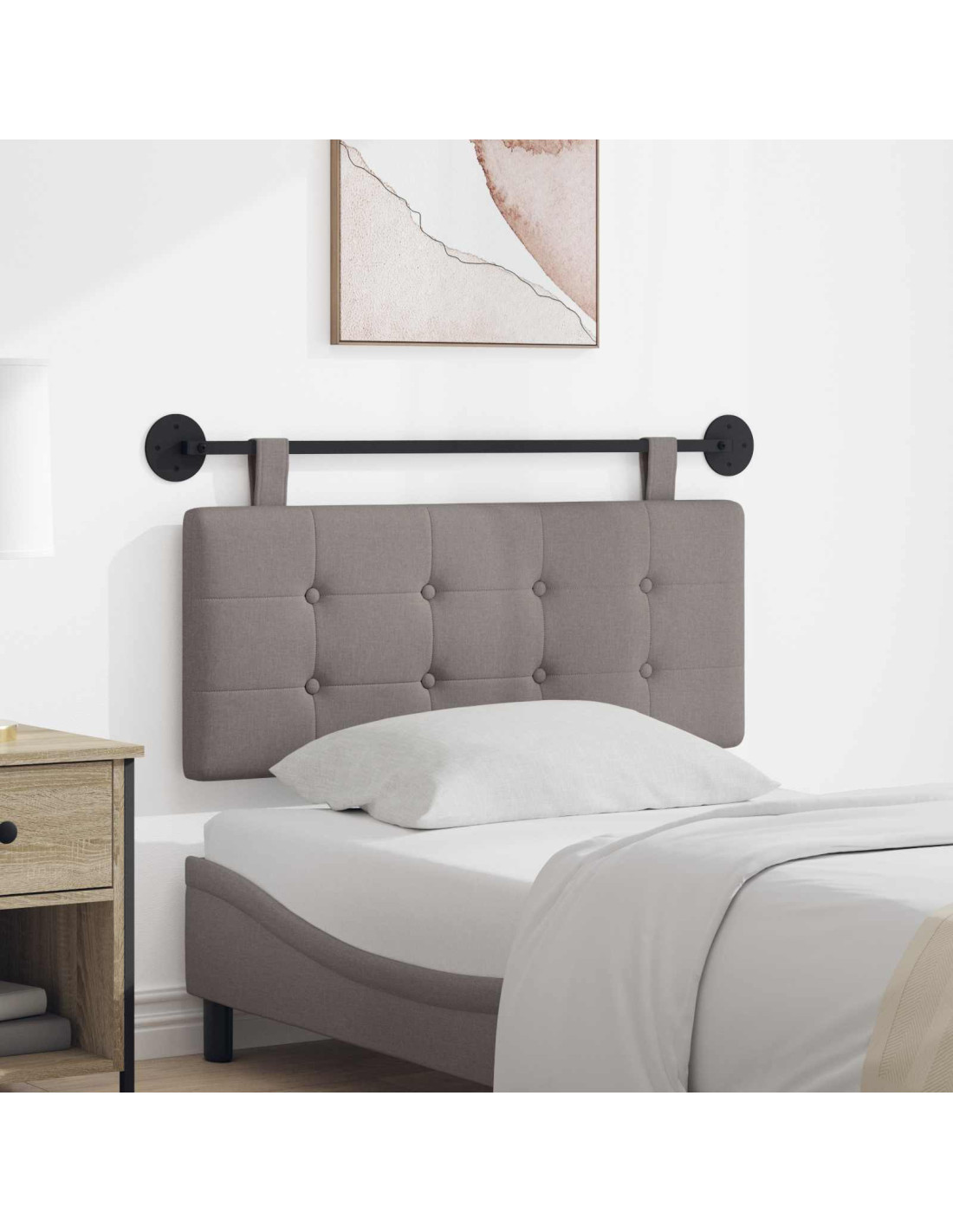 - Caratteristiche /Funzione /Design: Con un design sospeso, questa testiera si fissa bene al muro. La superficie rivestita aumenta il comfort, mentre il tessuto traspirante garantisce una piacevole sensazione al tatto. La cintura fissa ma removibile aggiunge praticità, rendendola un elemento versatile nel tuo spazio.