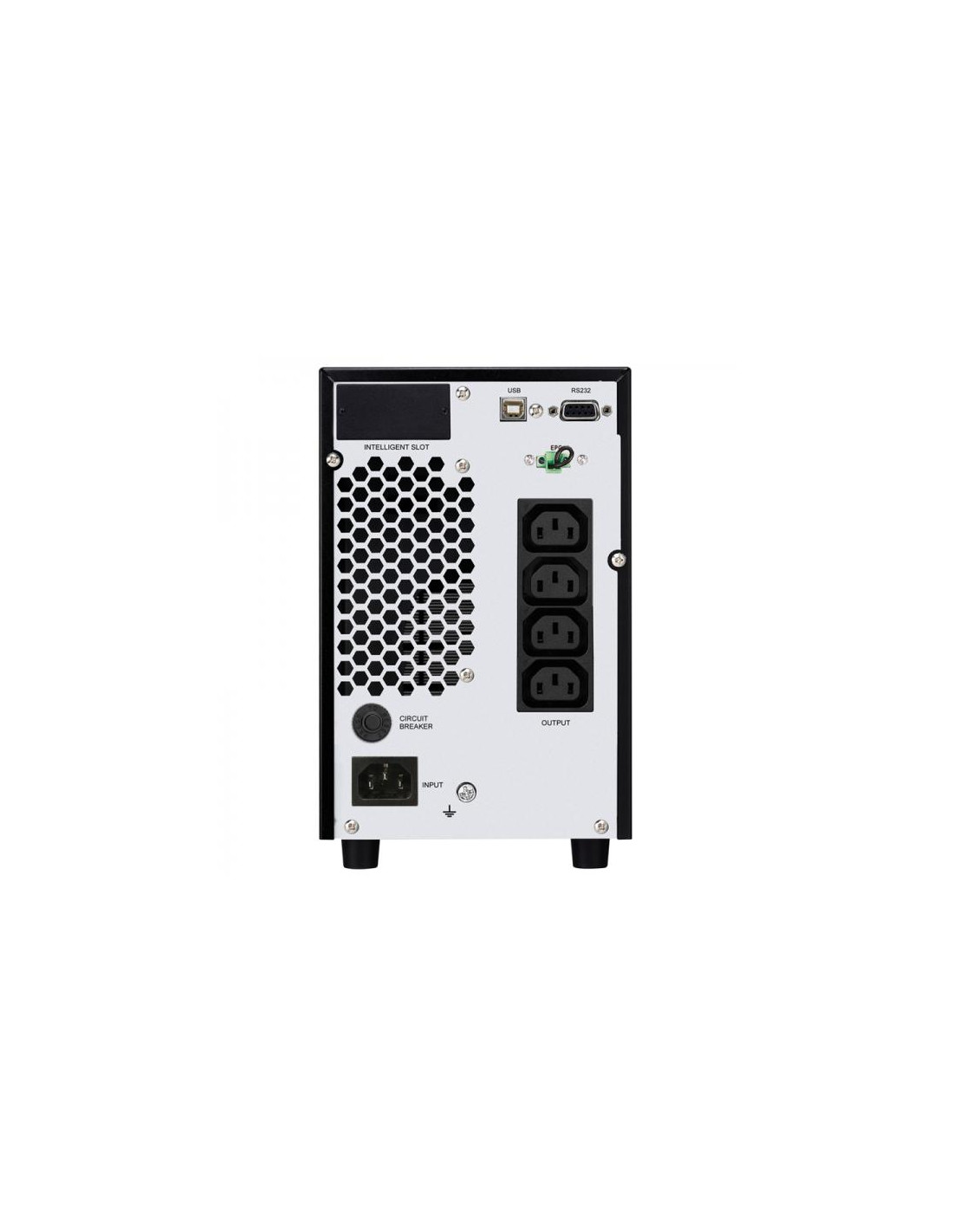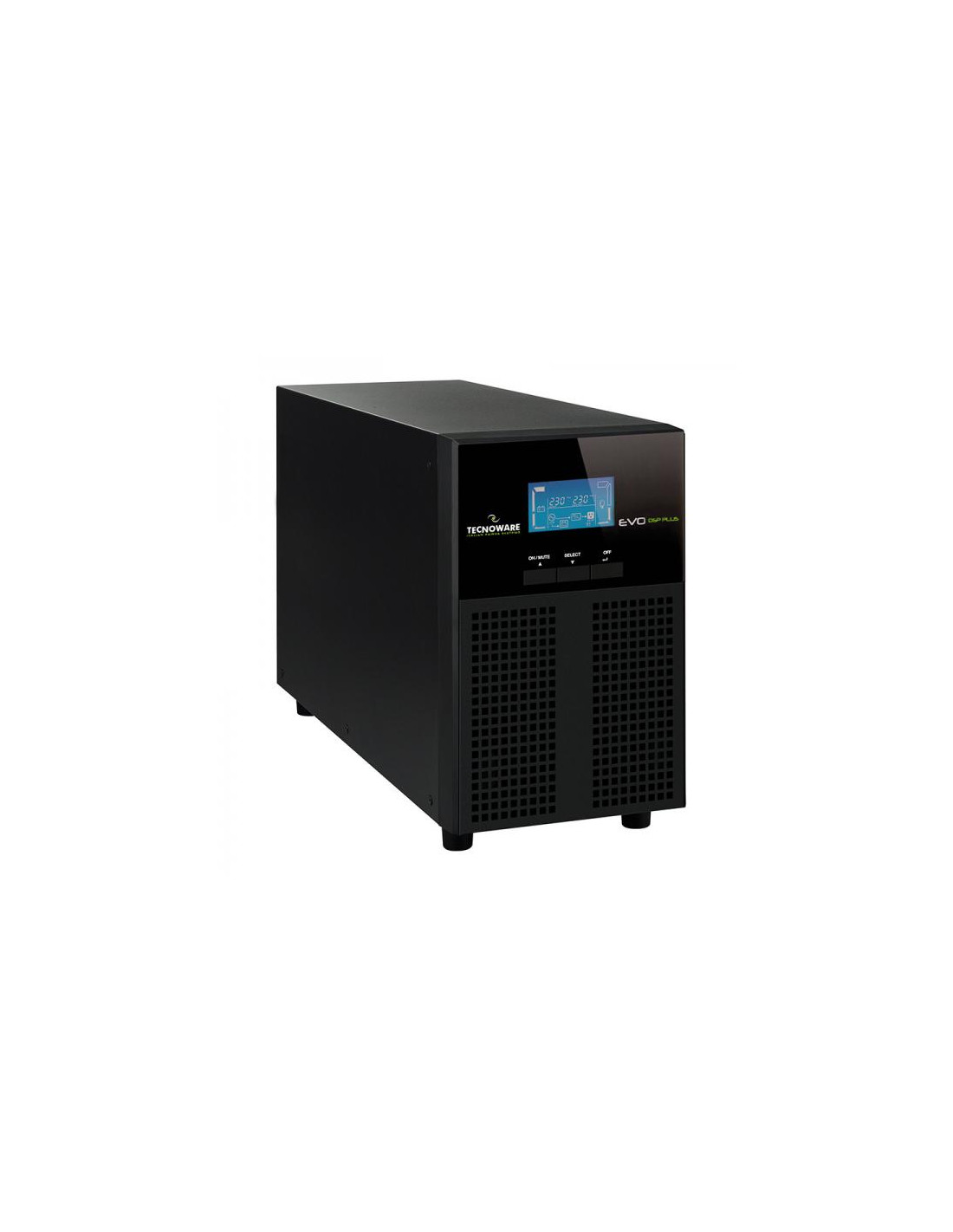 EVO DSP PLUS 2.400 - Potenza 2.400 VA PF 0,9. Tecnologia On Line (VFI) DSP, Efficienza 94%, Ingresso/uscita 230/230Vac 50/60Hz, dimensioni 14,5x22x39,7 cm, peso 17 Kg, autonomia 10 min, contiene 4 batterie da 12Vdc 9Ah, bypass automatico, porte di comunicazione USB ed RS232 per il controllo UPS e la programmazione di accensione/spegnimento tramite il software gratuito TecnoManager. Scheda SNMP, MODBUS o Dry Contact (opzionale).