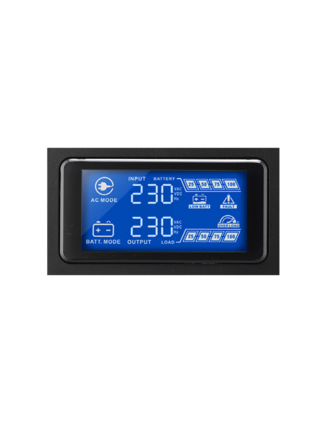 Attraverso il display LCD frontale è inoltre possibile monitorare immediatamente tutti i parametri fondamentali, come eventuali allarmi, stato di funzionamento a rete/batteria, il carico dell'UPS ed il livello di carica della batteria.