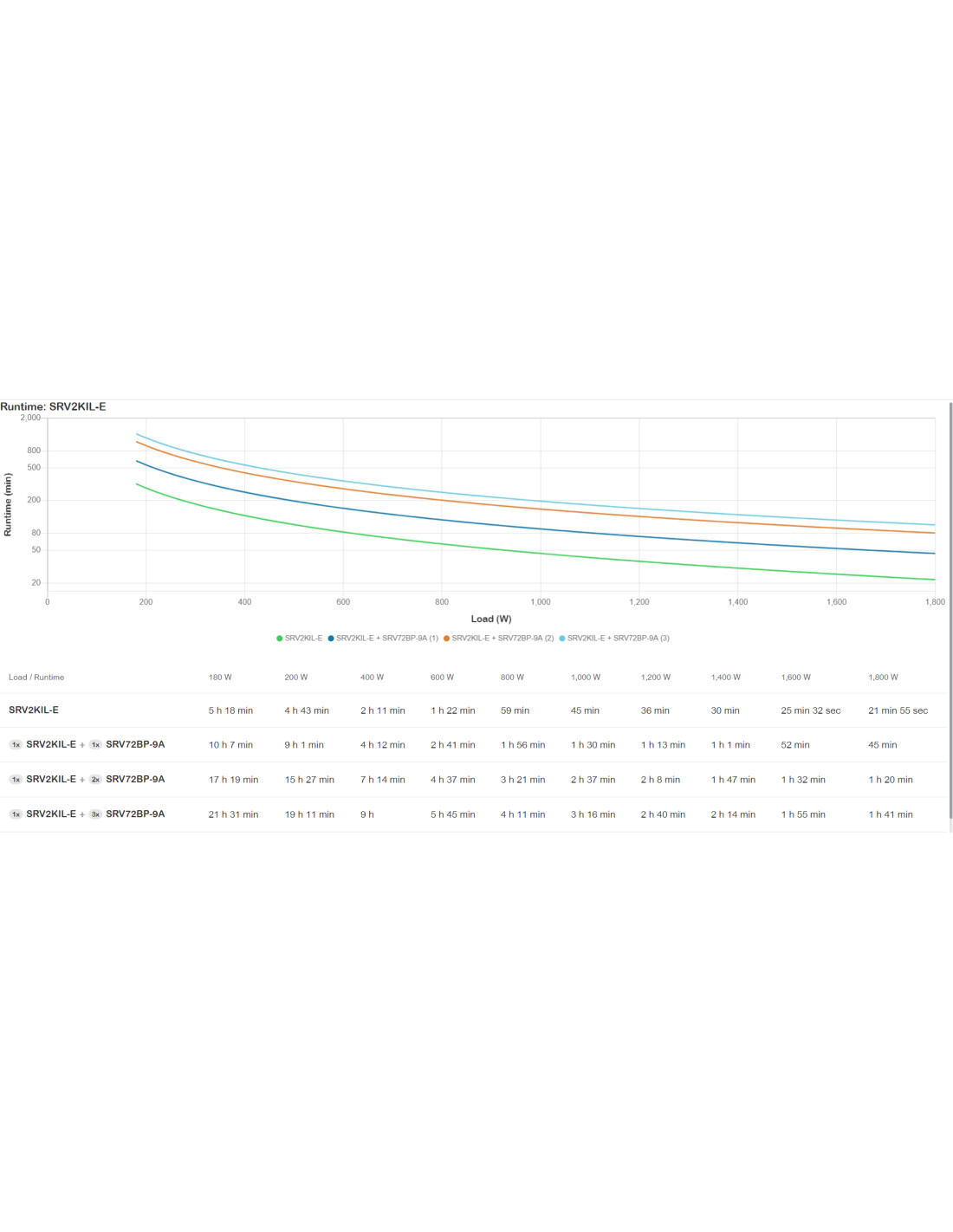 APC SRV2KIL-E. Potenza in uscita: 2 kVA, Potenza in uscita: 1800 W, Forma d'onda: Sinusoidale. Tipo di uscita AC: IEC 60320, Presa di corrente: Accoppiatore C20. Tecnologia batteria: Acido piombo (VRLA), Voltaggio della batteria: 72 V, Tempo di ricarica: 5,5 h. Colore del prodotto: Nero, Codice di protezione internazionale (IP): IP20. Larghezza: 335 mm, Profondità: 425 mm, Altezza: 336 mm