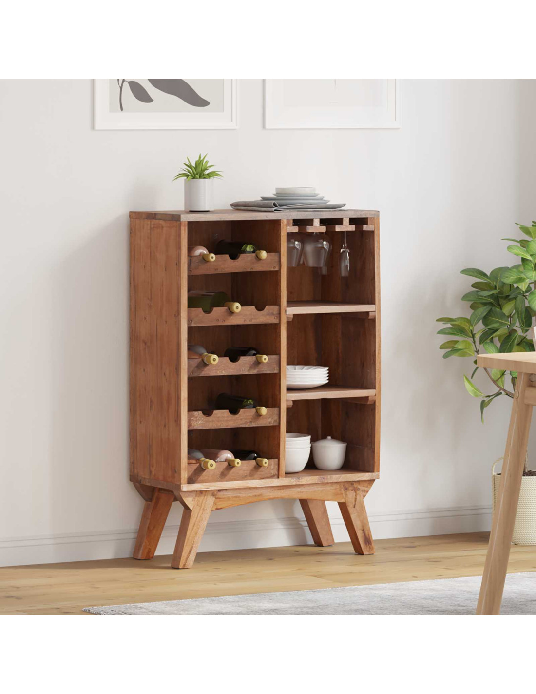 - Materiali naturali: Questo portabottiglie è fatto di legno massello di recupero, mostrando motivi del grano e colori caldi che aggiungono atmosfera a qualsiasi stanza. Usare legno recuperato è anche un'ottima scelta per l'ambiente, perfetta per chi ama il design e la sostenibilità.