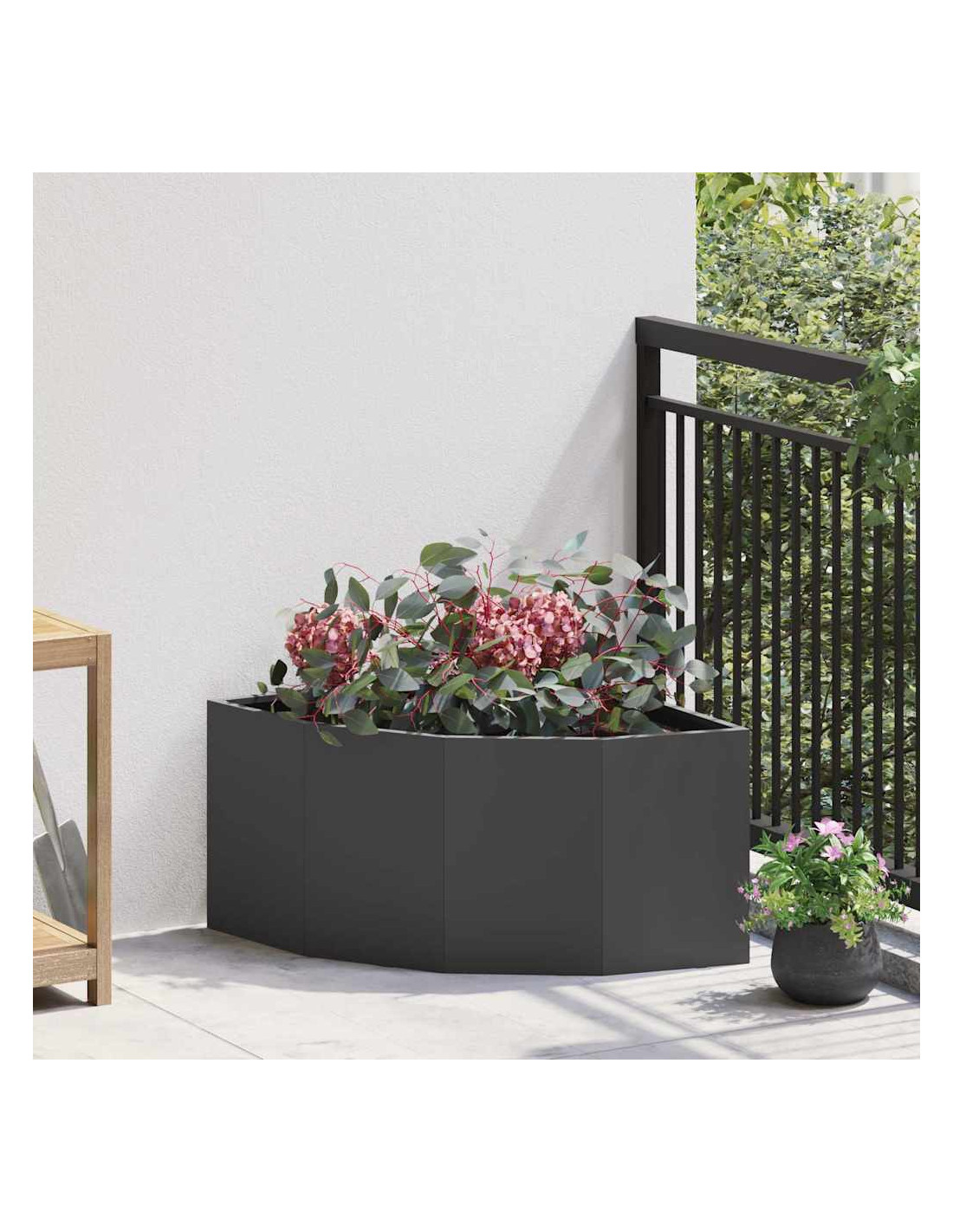 - Design angolare: È progettato per adattarsi meglio agli angoli, massimizzando l'uso dello spazio nel tuo giardino o patio. La sua struttura intelligente offre più spazio per le piante, rendendolo ideale per aree compatte che hanno bisogno di un po'di verde.