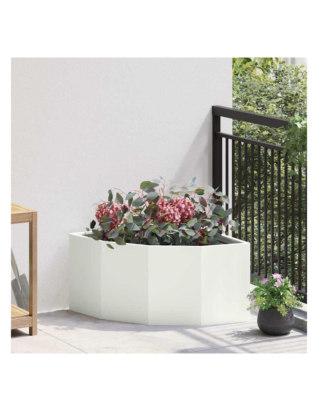 - Design angolare: È progettato per adattarsi meglio agli angoli, massimizzando l'uso dello spazio nel tuo giardino o patio. La sua struttura intelligente offre più spazio per le piante, rendendolo ideale per aree compatte che hanno bisogno di un po'di verde.