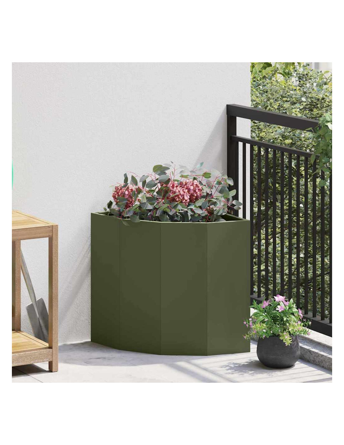 - Design angolare: È progettato per adattarsi meglio agli angoli, massimizzando l'uso dello spazio nel tuo giardino o patio. La sua struttura intelligente offre più spazio per le piante, rendendolo ideale per aree compatte che hanno bisogno di un po'di verde.