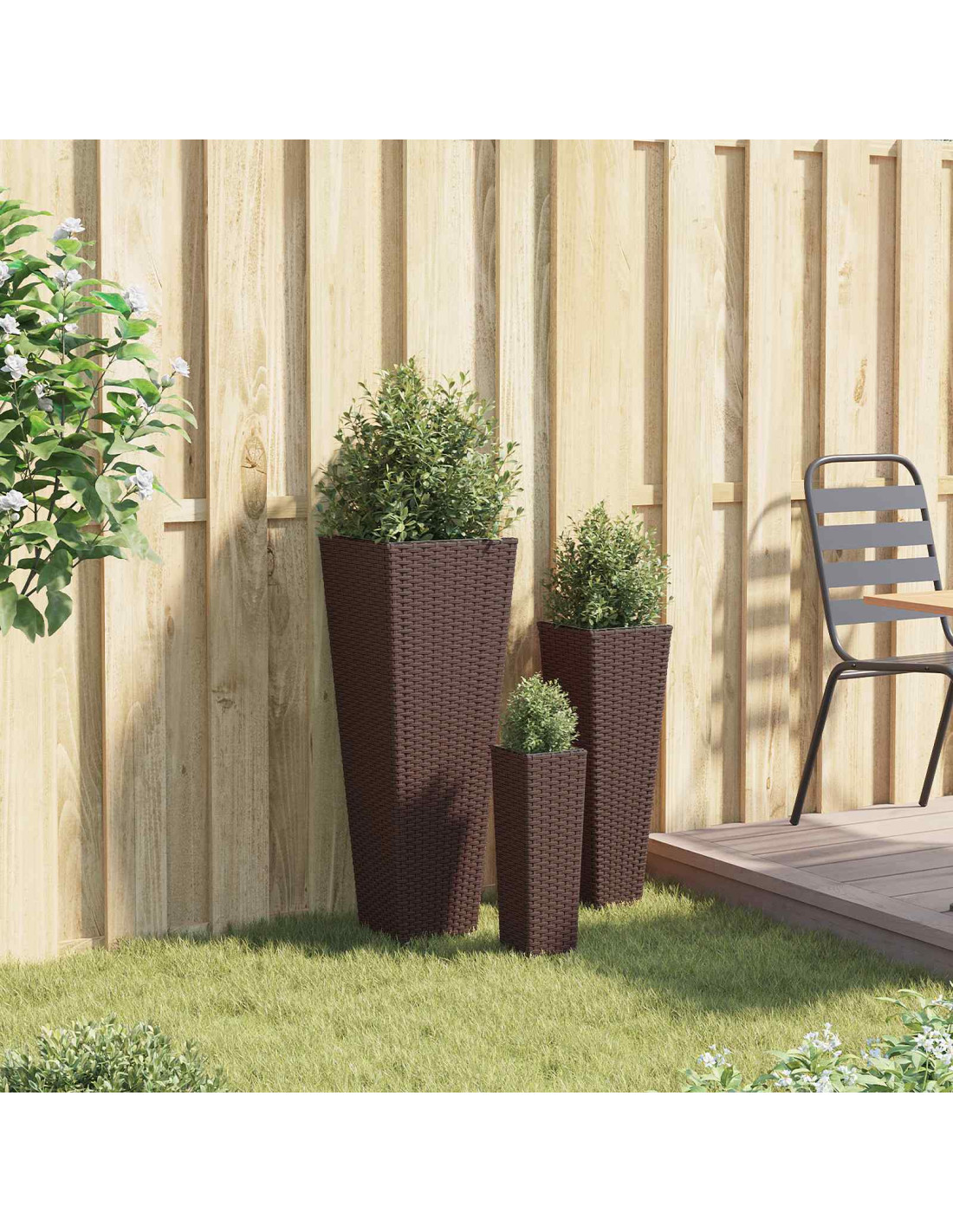 Questo set di fioriere alte per esterni aggiunge un tocco di eleganza a qualsiasi giardino o terrazza. È progettato per migliorare l'aspetto della tua casa, combinando stile e funzionalità. La forma trapezoidale e il motivo a intreccio offrono un look chic e minimalista, perfetto per diversi spazi all'aperto. Invita il verde nel tuo ambiente, ideale per chi vuole rendere i propri spazi esterni più eleganti e botanici.