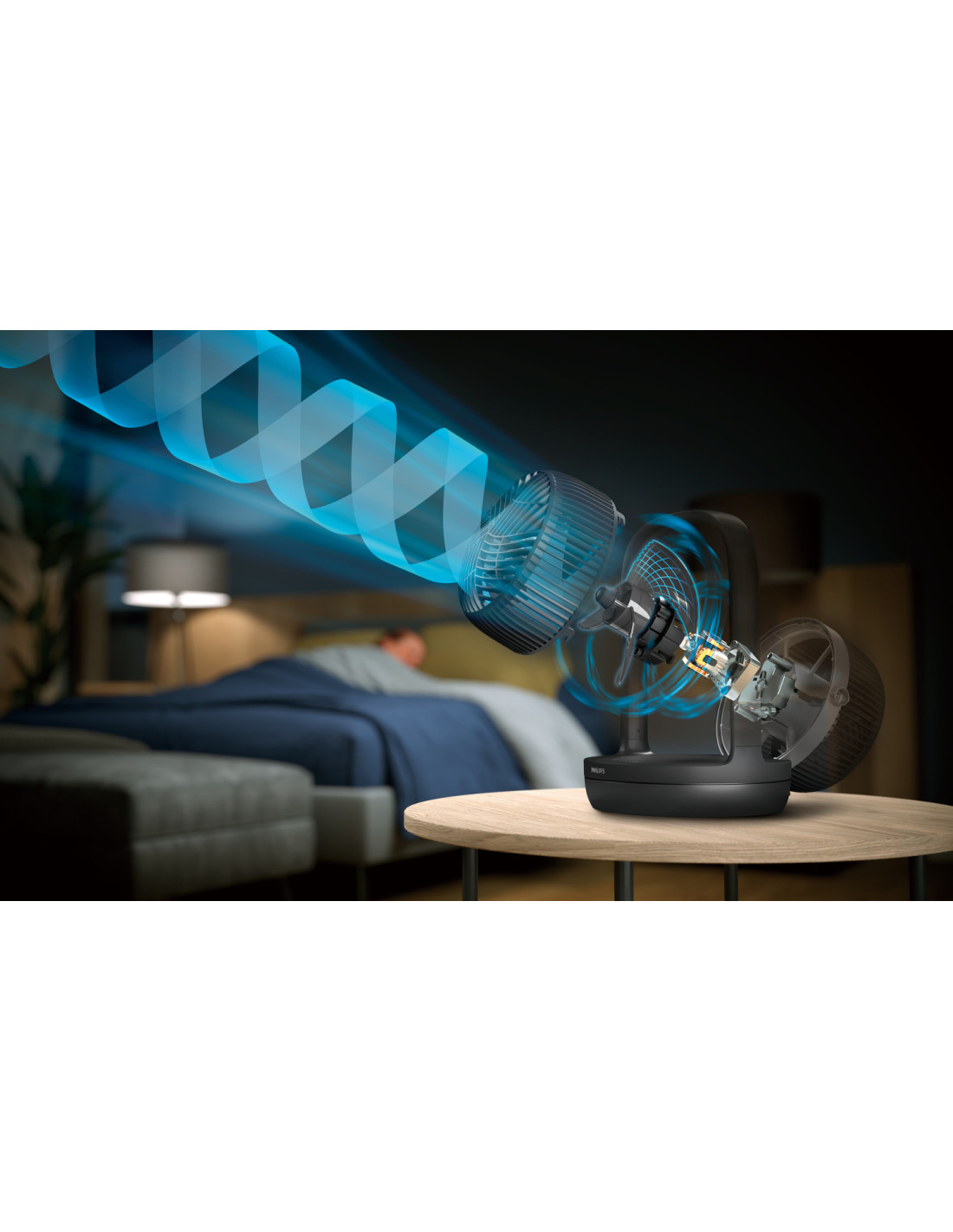 Il massimo del raffreddamento al minimo del rumore. Il ventilatore si adatta a qualsiasi arredamento d'interni e raffredda il tuo ambiente senza fare rumore. Personalizza la tua esperienza con 3 velocità, 2 modalità e un timer e, con la testa inclinabile e la funzione di rotazione, godrai di un migliore ricircolo dell'aria.