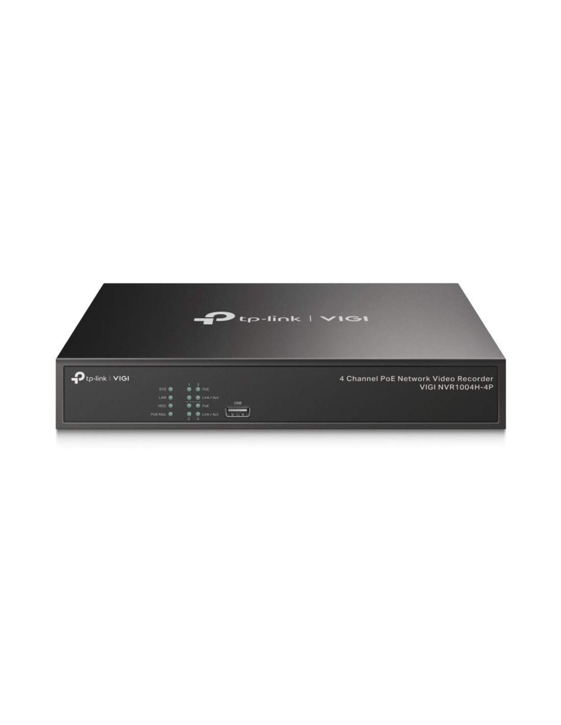 TP-Link VIGI NVR1004H-4P. Canali di ingresso video: 4 canali, Risoluzione massima: 3840 x 2160 Pixel, Modalità registrazione video: 720p, 1080p, 2160p. Capacità massima di memoria: 10 TB, Interfaccia hard disk: SATA. Protocolli di rete supportati: TCP/IP, DHCP, DNS, NTP, UPnP. Colore del prodotto: Nero. Consumi: 4,25 W, Corrente d'uscita: 1,31 A, Voltaggio di uscita: 53.5 V